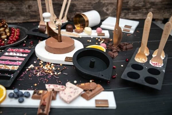 Setzen Sie die selbstgemachte Schokoladenscheibe auf einem Boska-Schaber auf den Tisch und lassen Sie Ihre Familie oder Freunde selbst Flocken machen und verwenden Sie die Schokoladenflocken, um Ihre Kuchen oder Ihre Desserts zu verzieren.