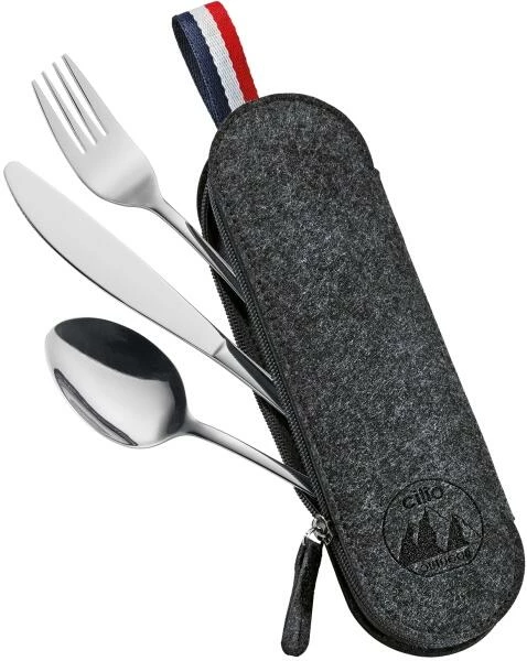 Mit dem dreiteiligen Besteckset sind Sie immer nützlich ausgestattet unterwegs. Die handgerechte Filztasche mit Reißverschluss und Griff bewahrt Messer, Gabel und Löffel ideal in Ihrem Rucksack oder ihrer Tasche auf. Essen sie wo es schön ist, ganz egal wo. Das cilio Besteckset VIAGGIO läd Sie dazu ein.