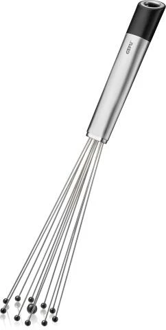 GEFU verfügt über Kugeldrähte aus Silikon und ist dadurch besonders für beschichtetes Kochgeschirr geeignet. Durch die große Aufschlagfläche kann am Topfboden nichts anhaften. Der Rührbesen ist bis zu 210°C hitzebeständig und leicht zu reinigen.