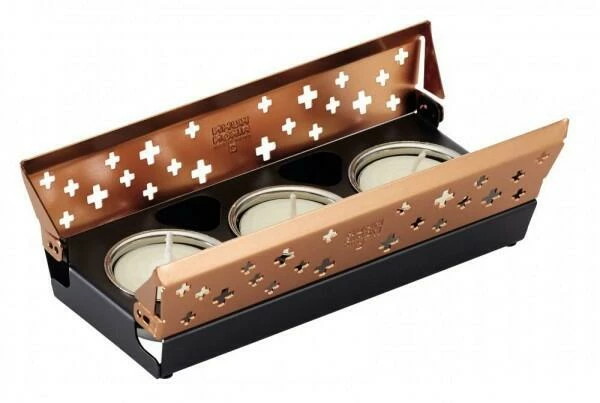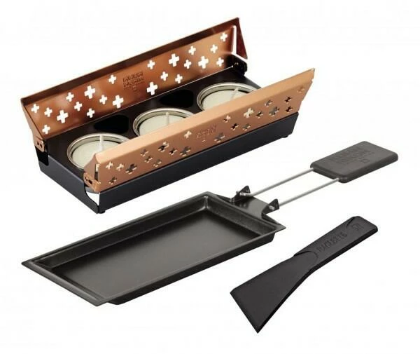- Set bestehend aus Rechaud mit 3 Kerzen, Raclette-Pfännchen (antihaftbeschichtet) mit ergonomischem Griff und Schaber aus Kunststoff (antihaftbeschichtet)
