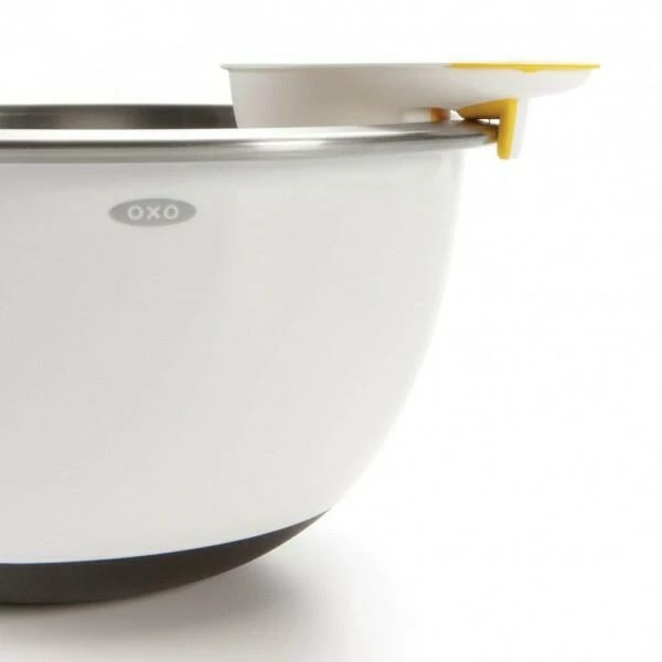 Mit dem OXO Good Grips 3-in-1 Eiertrenner lassen sich Eier sehr leicht aufschlagen und trennen. Dazu wird der Trenner seitlich in eine Schüssel eingehängt. Das Ei kann so an der Kante des Eiertrenners aufgeschlagen werden. Dank der Unterseite des Trenners können auch Eierschalensplitter mühelos aufgefangen werden. Zudem verhindert die Aufkantung, dass Eiweiß über die Schüssel auf die Arbeitsplatte tropft. Darüber hinaus verfügt der Eiertrenner über zwei verschiedene Halterungen, sodass er an den unterschiedlichsten Schüsseln angebracht und eingesetzt werden kann. Aufgrund seiner Größe und Form ist der Trenner gut zu verstauen, nachdem er bequem in der Spülmaschine gereinigt wurde, in der er am Besteckkorb angebracht werden kann.