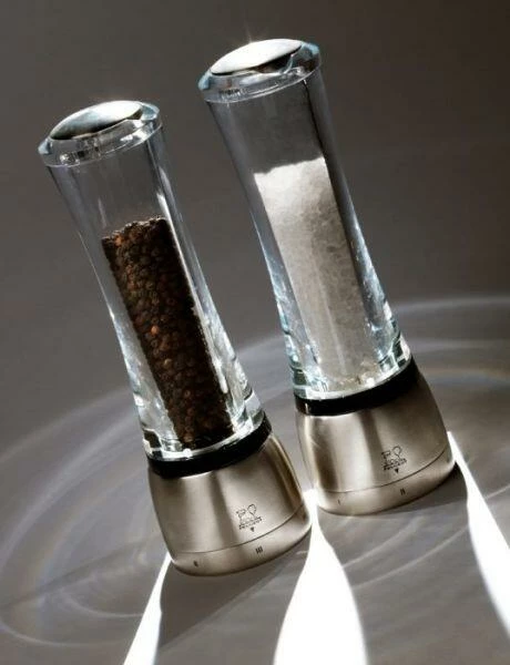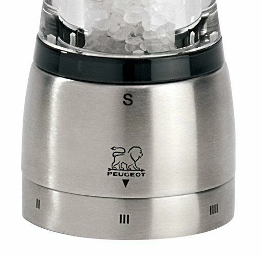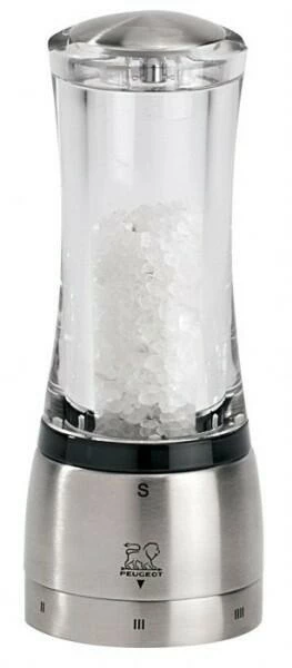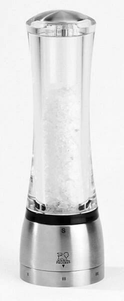 Salzmühle Daman in Acryl/Edelstahl mit justierbarem Mahlgrad. Die neue Mahlgradverstelltechnik der Salzmühle stellt eine von PEUGEOT patentierte Revolution im Mühlenbau dar.