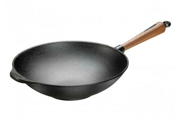 Wokpfanne mit Walnussgriff. Die Wokpfanne aus Gusseisen ist ein echter Allrounder zum Braten, Dämpfen, Garschwenken und Frittieren. Mit ihr gelingen nicht nur asiatische Gerichte, in ihr können Sie auch jede Art von Gemüse, Fleisch und Fisch dämpfen, schmoren und dünsten. Die bekannteste Garmethode in der Wokpfanne ist das Pfannenrühren, bei dem unter ständigem Rühren die Zutaten kurz und scharf angebraten werden.