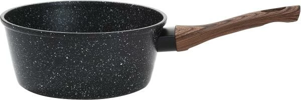 Der Soft-Touch-Griff in Holzoptik liegt besonders angenehm in der Hand. Durch die Antihaftbeschichtung läßt sich der Stieltopf leicht reinigen, auch in der Spülmaschine. Dier Topf ist induktionsgeeignet. Der Stone-Look mit weißen Sprenkeln auf schwarzem Grund sorgt innen wie außen für ein modernes Aussehen.