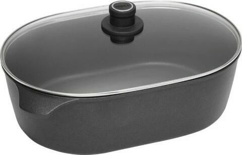 Woll Gussbräter mit Sicherheitsglasdeckel, induktionsgeeignet. Die Gussbräter Woll nowo Titanium vereint die Vorzüge des Woll Klassikers TitanPlus mit einem spürbar verringerten Gewicht. Die Seitengriffe sind backofenfest bis 250 °C.